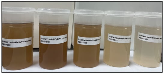 lignin@Fe3O4 suspended at various concentrations: 0.005% w/v, 0.004% w/v, 0.003% w/v, 0.002% w/v, and 0.001% w/v, (left-to right) in 0.1% w/v aqueous agar solution.
