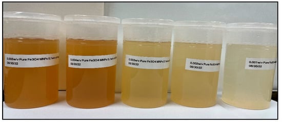 Visual inspection of uncoated Fe3O4 nanosuspension at a concentration of 0.005% w/v, 0.004% w/v, 0.003% w/v, 0.002% w/v, and 0.001% w/v (left-to-right) in 0.1% w/v aqueous agar solution.
