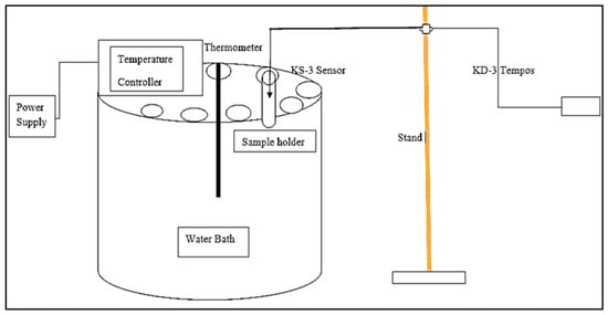 The thermal conductivity of the colloidal suspensions was measured using a TEMPOS thermal properties analyzer equipment (METER group’s device, Pulman, WA, USA) with a KS-3 sensor probe, which uses the transient line heat source method. It has a probe consisting of a needle with a heater and temperature sensor inside. The system monitors the sensor’s temperature when a current passes through the heater. Cole Parmer’s water bath (Staffordshire, UK) was utilized to keep the sample at the desired temperature of 25 °C, 30 °C, 35 °C, 40 °C, and 45 °C, respectively. Each suspension was poured inside the sample holder and kept inside the water bath for 4 h for uniform temperature distribution throughout the sample, which was measured using a thermocouple. A KS-3 probe was used to measure the thermal conductivity of the nanosuspension. Each suspension was analyzed at the five different stabilized temperature conditions previously mentioned under no externally applied magnetic field. The schematic diagram to measure the thermal conductivity of the aqueous nanosuspensions is shown in Figure 3.
