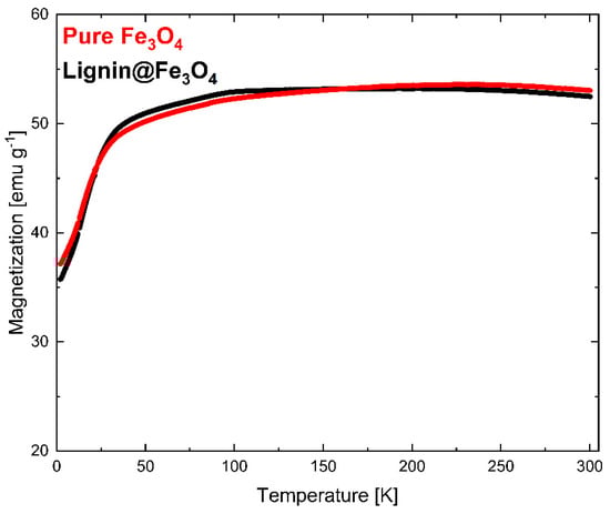 The magnetization curves at 300 K showed that pure Fe3O4 nanoparticles have a slightly higher magnetization than that of lignin-coated Fe3O4 (Figure 6). The results were confirmed through a magnetization vs. temperature profile in a 0.1 T externally applied magnetic field (Figure 7). Although the pure Fe3O4 nanoparticles do have a slightly higher magnetization than lignin-coated Fe3O4 above ~200 K, no substantial differences in the magnetization measurements were observed at any temperatures. This result confirms that lignin presence and encapsulation at the surface of the Fe3O4 nanoparticles does not significantly affect the nanocomposite magnetic properties using a 3:1 mass ratio of lignin to Fe3O4 in the preparation of the lignin magnetic nanocomposites. We have demonstrated the effect of increasing the lignin to magnetite ratio in a separate study, and similar results were obtained []. Magnetization increased linearly with temperature up to 100 K for both lignin@Fe3O4 and pure Fe3O4 and remained almost constant above 200 K, with a value of ~53 emu/g for both uncoated Fe3O4 and lignin@Fe3O4.