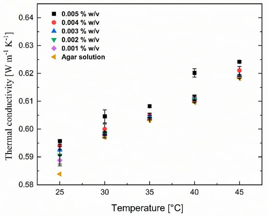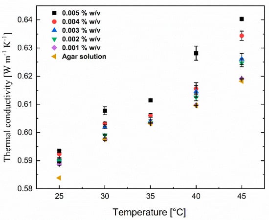 Measuring the thermal conductivity of the low-viscosity fluids and aqueous suspensions at different temperatures presents significant challenges and limitations due to free convective heat transfer, e.g., particle settling over time makes the fluid unstable. Using more viscous carrying fluids such as agar stabilizes the particles and prevents them from settling, enabling thermal conductivity measurements. For example, Ebrahimi et al. [] compared the accuracy of thermal conductivity measurements of water and an ethylene glycol/water solution stabilized by agar at different concentrations. The prepared nanofluid with agar showed high accuracy (within ±2% of those predicted by the Maxwell model). Hence, selecting the carrier fluid when the thermal conductivity properties of nanocomposite suspensions are measured is a critical aspect that needs to be considered.