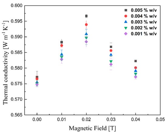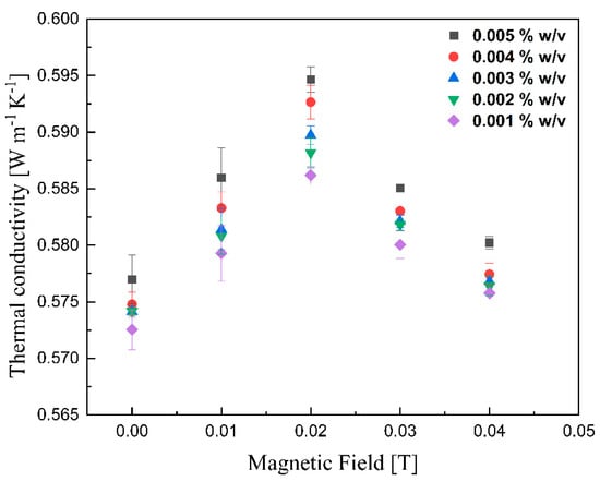 The thermal conductivities of various lignin@Fe3O4 colloidal nanosuspensions at different magnetic fields at room temperature are shown in Figure 10. With increasing magnetic field strength up to 0.02 T, the thermal conductivity was improved; however, the enhancement decreased drastically with further magnetic field strength increases. This peak maximum thermal conductivity has been reported for ferrofluids containing carbon nanotubes []. It is, however, the first time that this is reported for coated magnetic nanoparticles dispersed in an agar-based aqueous solution. The alignment of magnetic nanoparticles, which alters the thermophysical properties of magnetic nanofluids, in the direction of the magnetic field was responsible for the improvement of the suspension’s thermal conductivity [,,,]. As the magnetic field increases, the magnetization of the nanoparticles generates an attraction force stronger than the electrostatic attraction; this, in conjunction with the alignment of the magnetic dipoles, induces the formation of a chain-like structure [,,,]. The length of chains increases with increased magnetic field until the path length of the sample cell []. These clusters are believed to enhance the thermal conductivity of lignin@Fe3O4 nanoparticles by up to 5% compared with its base fluid. With increment fields greater than 0.02 T, the nanoparticles likely feel force strong enough to move them towards the external magnet []. As the nanoparticles move to the vessel’s wall [], the thermal conductivity decreases due to the lower concentration of nanoparticles dispersed in the fluid. Figure 11 shows similar results for the case of pure Fe3O4 nanoparticles; in this case, the conductivity increment, of 5%, induced by the magnetic field was just slightly lower than that caused by the lignin@Fe3O4 nanocomposite. In both cases, the enhancement is due to the aggregation effect and alignment of the nanoparticles [,].