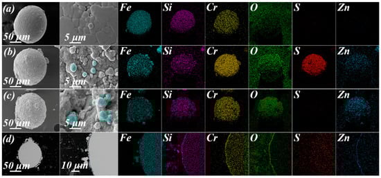 Deep white, bright white, and dark gray areas were observed in the field of view of the cross-section of the (Fe–Si–Cr + CIPs)/ZnO·SiO2·Cr2O3 composite powder (Figure 1d). The dark gray area was uniformly (~1.7 μm) thick, intermingled with the bright white area, and covered a dark white area. The bright white parts were re-colored blue during the image processing to clarify their distribution. Combining the cross-sectional image with the elemental maps, the dark white and dark gray areas were identified as the Fe–Si–Cr soft magnetic powder and the coating layer, respectively. It was inferred that the bright white particles between the dark gray cladding layer and the dark white Fe–Si–Cr soft magnetic powder embedded in the outer edge of the dark gray cladding layer were CIPs that were uncoated before the heat treatment. Wang et al. [4] showed that by virtue of its high reactivity and large specific surface area, CIPs provide additional reaction sites for the decomposition reaction of ZnSO4 during the hydrothermal coating process, promoting the growth of reaction products on the surfaces of the Fe–Si–Cr soft magnetic powders and CIPs. The absence of S in the cross-section of the (Fe–Si–Cr + CIPs)/ZnO·SiO2·Cr2O3 composite powder is possibly explained by volatilization of SO2, the decomposition product of ZnSO4, during the heat treatment process. The reaction mechanism and specific composition of the heat-treated insulation layer will be further explored.
