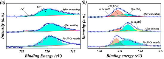 XPS spectra of (a) Fe and (b) O in the Fe–Si–Cr soft magnetic powder, (Fe–Si–Cr + CIPs)/ZnSO4 composite powder, and the (Fe–Si–Cr + CIPs)/ZnO·SiO2·Cr2O3 composite powders.