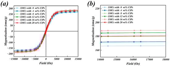Figure 8 shows the hysteresis loops of the Fe–Si–Cr-based SMCs doped with different CIPs contents at 25 °C. All samples exhibited good soft magnetic properties, including easy magnetization at room temperature, high saturation magnetization, and relatively low coercivity. To compare the saturation magnetization results of these SMCs in detail, the hysteresis loops in the 14,000–18,000 Oe range are magnified in Figure 8b. The saturation magnetization increased as the dopant amount increased from 0 to 16 wt%, reaching a maximum of 188.8 emu/g in the 16 wt%-doped Fe–Si–Cr-based SMCs. When the CIPs doping amount increased to 20 wt%, the saturation magnetization reduced to 180.7 emu/g because CIPs were introduced as a ferromagnetic phase (with a typical saturation magnetization range of 190–205 emu/g). The ferromagnetic phase increased the magnetic moment content per unit volume and encouraged coherent rotations of the magnetic moments during the magnetization process. For this reason, the saturation magnetization increases by 3.6% to 13.2% as the CIPs dopant amount increases from 4 to 16 wt% [19]. When the CIP doping amount reaches 20 wt%, the excessively numerous small particles agglomerate during the molding process, resulting in delamination of the coating layer and the formation of nonmagnetic-phase pores. A nonmagnetic phase is known to increase the magnetic dilution effect, impeding the free movement of magnetic moments during the magnetization process [20,21]. Therefore, increasing the doping amount to 20 wt% reduces the saturation magnetization by 4.4% from that of the 16 wt%-doped Fe–Si–Cr-based SMCs.