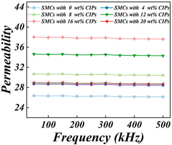 In Figure 9, the frequency-dependent effective permeabilities of the Fe–Si–Cr-based SMCs doped with different CIPs amounts are plotted. All SMCs show a frequency-stable initial permeability, which first increased and then decreased with an increasing CIP doping amount. The permeability was maximized (at 37.6) in the 16 wt%-doped Fe–Si–Cr-based SMCs and dropped to 28.5 in the 20 wt%-doped Fe–Si–Cr-based SMCs. Increasing the CIP doping amount improved the compressibility of the composite powders and reduced the internal stress of the SMCs. As introduced as a ferromagnetic phase, the CIPs also increased the magnetic moment per unit volume in the SMCs, facilitating magnetization of the SMCs under an applied magnetic field. Meanwhile, the CIP distribution in the insulation layer indirectly reduced the area, energy, and movement resistance of the domain walls. Therefore, the permeability increased as the doping amount increased from 4 to 16 wt%, as similarly reported by Liu et al. [22] and Zhu et al. [9]. When the doping amount further increased to 20 wt%, the direct contact between CIPs during molding process may result in the delamination of the coating layer and the re-formation of internal pores in SMCs. Consequently, the conduction efficiency of the magnetic circuit is reduced, the internal demagnetizing field is expanded, the domain-wall movement is limited, and the magnetic flux is scattered [23,24]. These processes reduce the permeability of the SMCs.