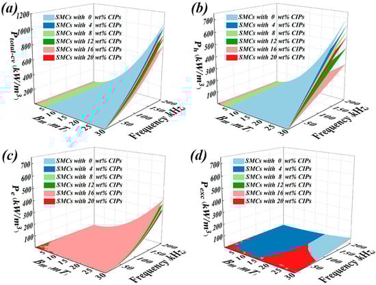 Figure 10a shows the total loss (Ptotal-cv) distributions of the Fe–Si–Cr-based SMCs doped with different amounts of CIPs. Regardless of doping content, the total loss monotonically increased with increasing frequency and field strength but increased and then decreased with increasing CIPs doping amount. At 30 mT and 200 kHz, the total loss was 1075.6 kW/m3 in the undoped SMCs, decreasing to 745.6 kW/m3 in the 16 wt%-doped SMCs. The total loss of the 20 wt%-doped SMCs reached 900.9 kW/m3. According to classical Bertotti loss-separation theory [25], Ptotal-cv can be divided into three losses—the hysteresis loss Physt, the eddy-current loss Pec, and the residual loss Pexc: