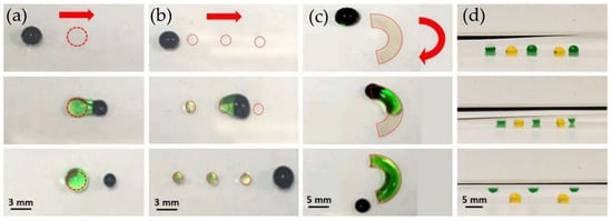 - Kim, J.H.; Kang, S.M.; Lee, B.J.; Ko, H.; Bae, W.G.; Suh, K.Y.; Kwak, M.K.; Jeong, H.E. Remote Manipulation of Droplets on a Flexible Magnetically Responsive Film. Sci. Rep. 2015, 5, 17843. [Google Scholar] [CrossRef]