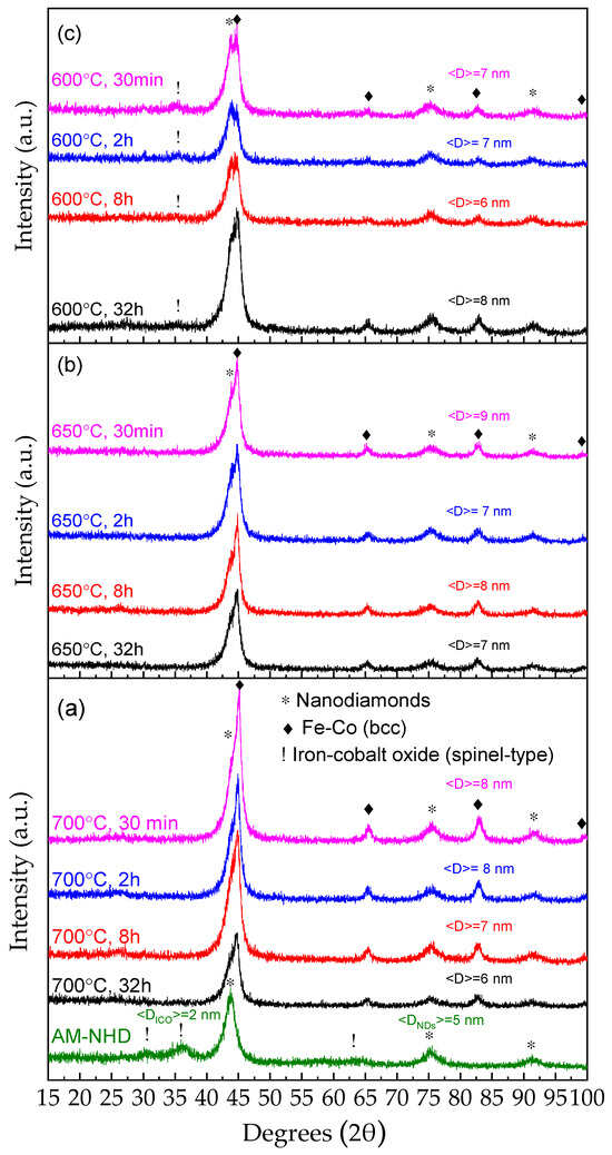 XRD patterns of a typical as-made nanohybrid precursor and the corresponding annealed samples at 700 °C (a), 650 °C (b), and 600 °C (c). The crystalline phases in the samples are depicted by respective different symbols denoting the angular positions of their main diffraction peaks. The average crystalline domain size <D> of the nanodiamonds and iron–cobalt oxide phases for the as-made nanohybrid precursor sample and that of the Fe–Co phase for all other samples are denoted in each pattern.
