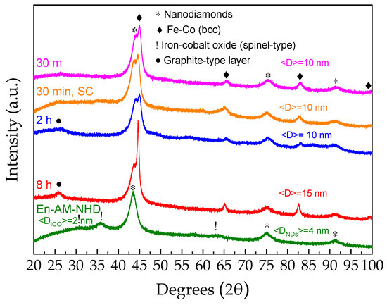 Following this context, in Figure 2, we show the XRD patterns of the En-AM-NHD precursor and corresponding annealed samples. According to these measurements, the two sets of samples (non-enriched and enriched with the 57Fe reagent) have many structural similarities. In particular, the XRD pattern of En-AM-NHD sample in Figure 2 depicts the dominant presence of the broad diffraction peaks attributed to NDs, along with the three inferior diffraction peaks referred to the ICO spinel-type phase, while the application of the Scherrer formula to the corresponding peaks of this diagram gives an estimation of the average crystalline domain size <DNDs> = 4 nm for the NDs, and <DICO> = 2 nm for the ICO NPs. Annealing of the En-AM-NHD precursor at 700 °C induces the development of Fe–Co bcc nanostructures in addition to the presence of the ND nanotemplates at all durations, as found for the conventionally prepared AM-NHD precursor. However, there are also some differences; at 26.5 °C 2θ, a diffraction peak is evident, especially for the samples with the longer duration annealing treatments of 2 and 8 h. This peak is attributed to a graphitic carbon-type phase, which has also been found to develop in similar iron carbide/ND hybrid samples prepared by the same synthesis route [48]. As in the case of the annealed samples prepared with the conventional AM-NHD precursor, the aspects of the nature, morphology, and stoichiometry of this, as well as the Fe–Co alloy phase, will be revealed by further TEM analysis (vide infra). The average crystalline domain size <D> for the Fe–Co phase in most annealing duration cases lies at 10 nm, which is only slightly higher to those found for the samples prepared with the conventional AM-NHD precursor (6–9 nm), and an increase in <D> to 15 nm for this phase is observed for the longest (8 h) annealed sample, suggesting that for this precursor, longer durations induce an increase in the Fe–Co particle size. As for the cases of the annealed samples for 30 min with conventional (NHD-700,30m) and slow cooling (30 °C/h) (En-NHD-700,30m-SC) rates, no major differences are observed in their XRD patterns.