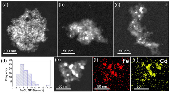 HAADF STEM images from different nanohybrid clusters of the NHD-700,30m sample (a–c). Distribution of the Fe–Co metallic nanoparticles sizes (d). HAADF STEM image of a particular hybrid Fe–Co nanoparticles/nanodiamonds cluster (e) and the corresponding elemental distribution of Fe (f) and Co (g).