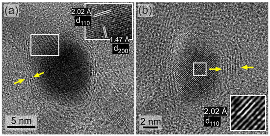 HRTEM images of two different Fe–Co metallic nanoparticles (a,b) grown on the NHD-700,30m sample where the {110} and {200} planes are resolved in (a) and only the {110} planes are resolved in (b). The planes are highlighted in the blown-up white rectangles along with their d-spacings. Graphitic-type layered structures wrapped around the metallic nanoparticles are indicated by the yellow arrows.
