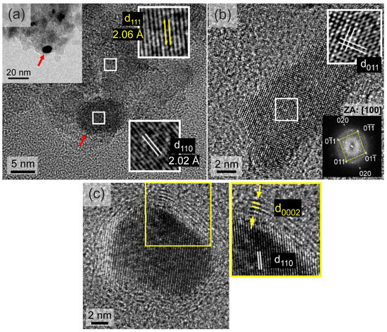 (a) HRTEM image of a typical Fe–Co nanoparticle/nanodiamonds cluster in the En-NHD-700,30m-SC sample. The {111} planes of a nanodiamond nanoparticle and the {110} planes of a bcc Fe–Co metallic nanoparticle (indicated with the red arrow) are provided. (b) HRTEM image from another metallic Fe–Co nanoparticle projected along [100]. (c) HRTEM image showing a Fe–Co nanoparticle surrounded by a graphitic-type few-layer structure, with the {110} planes of the metallic bcc and the {0002} planes of the graphitic-type structures indicated by white and yellow fonts.