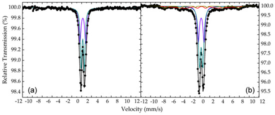 Fitted 57Fe Mössbauer spectra of the NHD-700,30m (a) and of the En-NHD-700,30m-SC (b) samples collected at room temperature. The black dots correspond to the experimental data and the colored lines and filled areas to the components used to fit these spectra listed in Table 2.