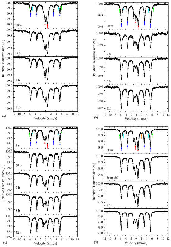 Room temperature raw 57Fe Mössbauer spectra of the samples synthesized using the conventional as-made nanohybrid precursor annealed at 600 °C (a), 650 °C (b), and 700 °C (c) and the 57Fe-enriched as-made nanohybrid precursor annealed at 700 °C (d). The annealing duration at the specified temperatures is included in each spectrum. The colored arrows denote the positions of the main spectral contributions corresponding to the iron-bearing phases, as discussed in the text.