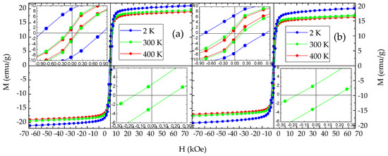 Magnetization vs. applied magnetic field isothermal loops of the NHD-700,30m (a) and En-NHD-700,30m-SC (b) samples measured at different temperatures indicated by different colors. The insets in each set of measurements show the details of the loops’ characteristics around zero applied magnetic field for all temperatures (upper left) and with even more detail for the 300 K loop (lower right).