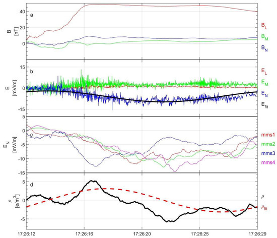 (a) The magnetic fields in the LMN coordinate system; (b) the electric fields in the LMN coordinate system and the Fourier fitting of the electric field; (c) the smoothed electric fields in the N direction measured by four spacecraft; (d) the charge density.