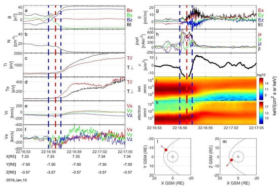 An example of a burst-mode interval crossing the magnetopause observed by MMS between 22:16:53 UT and 22:17:05 UT on 10 January 2016 in GSM coordinate. (a) Three components of the magnetic fields and magnetic field strength; (b) electron number density; (c) ion temperature; (d) electron temperature; (e) three components of the ion bulk velocity; (f) three components of the electron bulk velocity; (g) three components of the electric field and electric field strength; (h) three components of the current density and current density strength; (i) charge density; (j) ion and (k) electron omnidirectional differential energy flux; (l,m) satellite location, where the red arrows show the normal direction of the magnetopause. The red dashed line marks , and the blue dashed line marks the inner and outer boundaries of the charge layer.