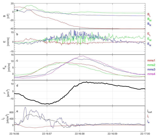 (a) The magnetic fields in the LMN coordinate system; (b) the electric fields in the LMN coordinate system; (c) the smoothed electric fields in the N direction measured by four spacecraft; (d) the charge density; (e) the parallel current from the curlometer (black), ion (red), and electron (blue).