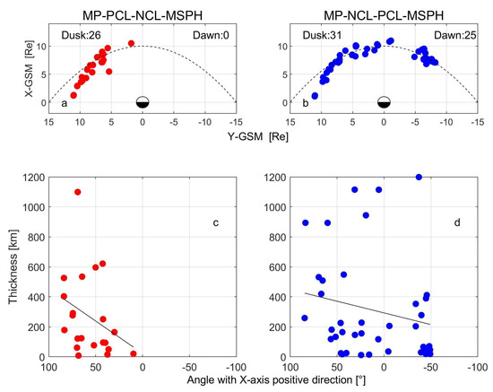 Statistical distribution of the locations of crossing events: (a) positive charge on the outside and negative charge on the inside of the magnetosphere, marked by red dots; (b) negative charge on the outside and positive charge on the inside of the magnetosphere, marked by blue dots; (c) the PCL thickness in relation to azimuthal distribution in MP-PCL-NCL-MSPH events; (d) the NCL thickness in relation to azimuthal distribution in MP-NCL-PCL-MSPH events.