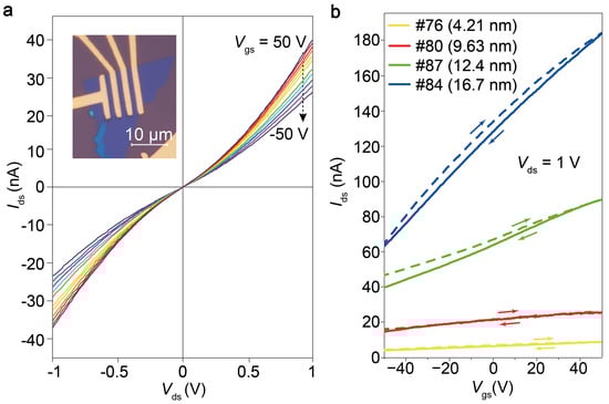 I-V curves of a typical thin-layer Nb3Cl8 device with gate voltage varying from −50 to 50 V are shown in Figure 2a, while its optical microscopy image is shown in the inset. Non-linear I-V curves are obtained by varying the drain voltage in between ±1 V, which means a non-ohmic contact is formed between Nb3Cl8 and electrodes. By increasing the gate voltage gradually from −50 to +50 V, the absolute value of is increasing. Fixing the constantly at +1 V, by changing Si gate voltage from −50 to +50 V gradually, the field-effect curves are obtained and shown in Figure 2b. Combing transfer curves shown in Figure 1a,b, the intrinsic N-type semiconductor of thin-layer Nb3Cl8 device can be confirmed, which is consistent with the previous work []. Compared with the transfer curves for devices at different thickness in Figure 2b, we can find that increasing thickness of Nb3Cl8 could play a positive role to give rise to . This phenomenon could be attributed to an improved contact and/or a channel conductivity enhancement. The field-effect curves exhibit similar trends for each thickness devices, and the on-off ratio is approximately consistent. This indicates that the electrical modulation of the material remains relatively stable across the range of thicknesses from 4.21 to 16.7 nm tested in this experiment.