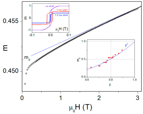 Approach to magnetic saturation in the numerical simulation (m = M/Ms). The blue line shows the contribution of the spin-frustrated shell and the black solid line, the total nanoparticle response described by Equation (2). Upper left inset: hysteresis loops for a particle without and with a shell. Dependence of the technical saturation magnetization of a particle on the parameter .