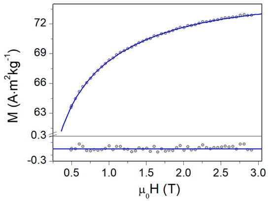 Approach to magnetic saturation in polyethylene glycol-coated magnetite nanoparticles at 50 K [36] and data fitting using Equation (4). The lower panel shows the residual plot (the difference between the measured M value and the predicted by Equation (4)).