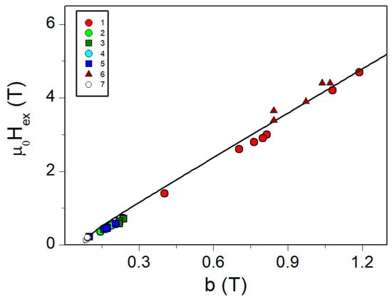 Correlation of parameters b and Hex in different magnetite nanoparticle samples: (1) magnetite nanoparticles with the polyethylene glycol shell [59] (magnetization curves were measured at different temperatures, so one sample corresponds to several points); (2,3) magnetite nanoparticles with the SiO2 shell [59] (4,5) magnetite nanoparticles with minopropyltriethoxysilane and aminopropyltriethoxysilane/tetraethoxysilicate shells [60], (6) maghemite nanoparticles [17], and (7) lamellar magnetite nanoparticles [55].