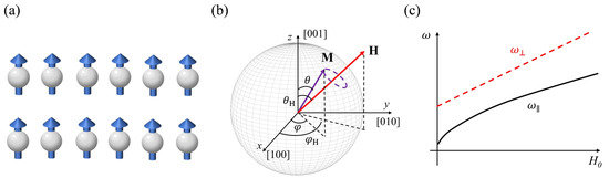 For ferromagnetic samples, as shown in Figure 1a,b, the magnetic moments consistently align in the same direction under the action of the external magnetic field H0, resulting in a state of single domain state. For the homogeneously precessing magnetization described by Kittel (), only the effects of the external magnetic field H0, the anisotropy field HK and the demagnetizing field Hd need to be considered []. And for the convenience of derivation and discussion, the direction of M and H0 is represented in the spherical coordinates by the polar angle and the azimuthal angle , as shown in Figure 1b. In this scenario, the total free magnetic energy F can be expressed as: