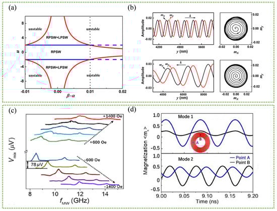 Another result we can get from the Kittel equation is that the spin waves excited in ferromagnets are always right-handed (RH), which has been confirmed by traditional FD-FMR experiments [,,]. However, this conclusion may shift when considering the role of STT [,,,,], as it introduced complexity to traditional FMR modes, giving rise to a variety of new spin wave phenomena, such as propagating spin waves [,], spin-wave Doppler shift [], magnetic droplets [,,,,] and spin-wave bullets [,]. Figure 2 shows two novel resonance phenomena caused by the ST-FMR technique. Zhou et al. [] proved that stable left-handed (LH) polarized spin waves can be introduced into ferromagnets when a spin-polarized electrical current is presented. As shown in Figure 2a,b, the RH polarized spin waves and the LH polarized spin waves coexist in a ferromagnet when the spin current density is larger than a critical value, which is mainly due to the contribution of the coefficient of the nonadiabatic STT []. Interestingly, STT can not only change the polarization of the excited spin waves, but also induce additional magnon modes. Qin et al. [,] revealed that two resonance states with distinct resonance frequencies could appear in a nanoscale ring shape confined MTJs by launching the ST-FMR measurement, as illustrated in Figure 2c. The corresponding micromagnetic simulation results (see Figure 2d) distinctly depicted the magnetic moment precession of the two resonance states defined as mode-1 and mode-2, respectively. For mode-1, nearly all local magnetization precesses almost simultaneously in the same direction (acoustic-like). Conversely, for mode-2, local magnetizations in parts A and B precess in opposite directions (optic-like), suggesting that the two resonance states both originate from the in-phase and anti-phase localized magnetization oscillation. These studies undoubtedly prove the importance of ST-FMR in the measurement of spin dynamics in magnetic nanostructures. At present, the generation and regulation of spin waves by STT has become a research hotspot in the field of magnonics [,,,,,,,].
