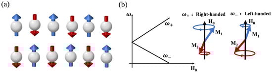 Better than in-plane magnetized materials, magnetic thin films with perpendicular magnetic anisotropy (PMA) have attracted great interest due to their unique advantages such as greater information storage density, higher thermal stability, and faster response frequency [,,,,,]. Recent studies have shown that, similar to collinear AFMs, magnetic resonance modes with right-handed and left-handed precession can also be excited in PMA-SAFs [,]. In addition, conventional techniques employed for ferromagnetic materials, such as the magneto-optical Kerr effect and anomalous Hall effect, can be applied to detect the magnetic state or texture in SAFs, suggesting that PMA-SAFs structures can not only possess the characteristics of abundant polarization degrees of freedom of collinear AFMs, but also the spin dynamics is detectable by the same methods as FMs, which provide an attractive platform for designing the next generation of field-effect transistors based on magnon polarization. Here, we expand the description of the two resonance modes with opposite polarization in PMA-SAFs.