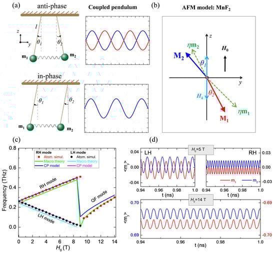 (a) Classical mechanical model of coupled pendulums. (b) Sketch of magnetization oscillations of AFM sublattices. H0 is the external magnetic field, while HK denotes the uniaxial magnetic anisotropy. (c) Comparison of resonance spectra of MnF2 for the atomistic LLG simulations (red squares and black circles), along with the analytical results from the macrospin model (the green and cyan curves) as well as the coupled pendulum-like model (blue and magenta curves). (d) Anti-phase magnetization precession of the two sublattice m1 and m2 simulated at H0 = 5 T (<) for the left-handed and right-handed resonance modes, and the in-phase magnetization precession of m1 and m2 at H0 = 14 T (>) for the quasi-ferromagnetic resonance mode. (Reprinted with permission from Ref. []. Copyright 2023, Institute of Physics).