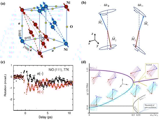 - Satoh, T.; Cho, S.J.; Iida, R.; Shimura, T.; Kuroda, K.; Ueda, H.; Ueda, Y.; Ivanov, B.A.; Nori, F.; Fiebig, M. Spin Oscillations in Antiferromagnetic NiO Triggered by Circularly Polarized Light. Phys. Rev. Lett. 2010, 105, 077402. [Google Scholar] [CrossRef]
