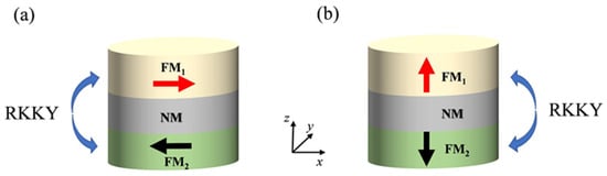 - Bruno, P.; Chappert, C. Oscillatory coupling between ferromagnetic layers separated by a nonmagnetic metal spacer. Phys. Rev. Lett. 1991, 67, 1602–1605. [Google Scholar] [CrossRef] [PubMed]