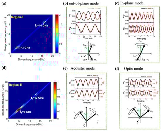 The simulated FMR response signal for SAFs with in-plane uniaxial anisotropy in region-I (a) and region- II (d). The corresponding dynamic behavior of the two FM layers in the out-of-plane mode, (b) in-plane mode, (c) acoustic mode, (e) and optic mode (f). (Reprinted with permission from Ref. []. Copyright 2022, Institute of Physics).