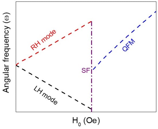 Figure 9 shows the resonance frequency spectra (i.e., the dispersion relations) obtained by Equation (15). Here, and represent the resonance frequencies of the RH mode and LH mode, respectively. Note that for symmetry-breaking SAFs ( or ) the magnetic field are no longer equal and Equation (15) needs to be corrected accordingly []: