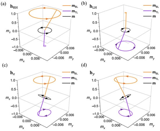 We then discuss the possible polarization under the condition of degeneracy between the two precession modes. Recent theoretical and experimental work show that the precession chirality of the magnon modes in the crossing field is directly dependent on the polarization of the rf microwave magnetic field [,]. Figure 10 shows the detailed trajectories of each magnetization under the application of four types of microwave fields. When the microwave field is taken as the counterclockwise (CCW) form of , see Figure 10a, the magnetization of the bottom layer mBL performs an active precession state (large circle) while the top layer mTL behaves as a forced precession state (small circle). In this case, the net magnetization precesses with a CCW rotation around the z-axis, i.e., RH polarization. But when the microwave driving field is taken as the clockwise (CW) form of , mTL will go to the active precession state while mBL will perform as the forced precession state, as shown in Figure 10b. And m performs a LH polarization procession. However, when the x-type microwave magnetic field is applied, the x-components of both mBL and mTL oscillate in-phase while the y-components oscillate out-of-phase with time, see Figure 10c. This type of magnetization resonance results in a periodic oscillation of the net magnetization in the x-direction and a constant value in y-direction (). In contrast, for a y-type microwave field , see Figure 10d, the x-components oscillate out-of-phase while the y-components oscillate in-phase, showing an oscillation in the y-direction and a constant value in the x-direction (). From the above phenomenon, we can conclude that when a linearly polarized microwave field is applied, the precession trajectory of the net magnetization becomes linear and oscillate in the direction of the corresponding microwave field. However, when a circularly polarized microwave field is applied, the precession trajectory of m will also become circular. These results reveal that arbitrary polarizations, including elliptically or linearly polarized magnons, can be achieved by the corresponding type of microwave magnetic field in PMA-SAFs, which provides a new road for us to exploit the polarization degree of freedom of the magnon to realize information transmission.