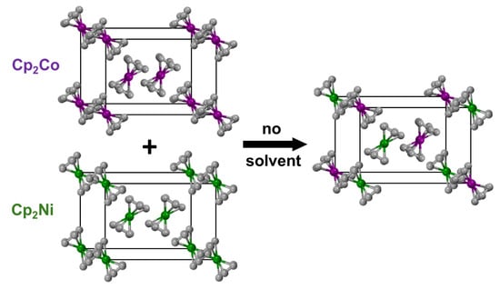 - Harmon-Welch, G.E.; Hoefler, J.C.; Trujillo, M.R.; Bhuvanesh, N.; Bakhmutov, V.I.; Blümel, J. Creating Solid Solutions of Metallocenes: Migration of Nickelocene into the Ferrocene Crystal Lattice in the Absence of a Solvent. J. Phys. Chem. C 2023, 127, 3059–3066. [Google Scholar]