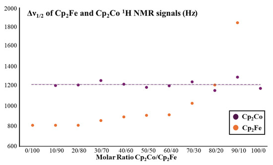 1H MAS NMR halfwidths Δν1/2 of the isotropic lines of ferrocene (1) and cobaltocene (3) in their solid solutions with the indicated molar ratios. The spinning speed was 10 kHz.