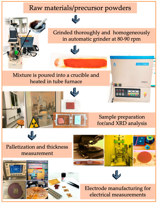 The (BXFO), (X = La, In, Y, Nd, Gd), high-entropy oxides and single-component oxide (BFO) were fabricated by the conventional solid-state method with high-purity , , , , , , and as starting powders. BXFO was prepared using the molar ratio of the precursors (:::::: = 0.5:0.1:0.1:0.1:0.1:0.1:1). For each sample, powders were weighed according to the stoichiometric formula of each element. After weighing the reagent powders with a precision balance, they are transferred to the grinder’s agate mortar (SFM-8 Agate Mortar Grinder), adding isopropanol to improve the mixing process and thus the homogeneity of the compound, which at this stage is mixed for 6 h at rate of 80–90 rpm. At the end of the mixing process, the powders were air-dried and then poured into an alumina crucible for the heat treatment (calcination). A cylindrical alumina furnace, model GSL—1700X was used, and the samples were heated at different temperatures to study the effect of temperature on the structure and crystallinity. Calcination temperature ranged from 830 to 1200 °C for 3h at 5 °C . The synthesized powders were then pressed into a 16 mm diameter pellet under a uniaxial pressure of 10 kN for 10 min, followed by sintering at 700 °C for 2 h at 5 °C·min−1; a Veeco Dektak 6M Stylus Profilometer was used to measure the thickness. A schematic representation of the various steps involved during the synthesis process is shown in Figure 1.
