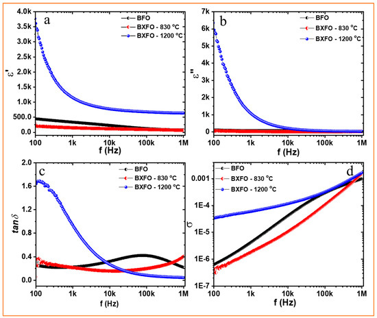 A comparison of the electrical properties of the samples BXFO-830 °C and BXFO-1200 °C with pristine BFO: (a) the real part of electrical permittivity as a function of frequency and (b) the imaginary part of electrical permittivity (dielectric losses). (c) A graph of the trend of the dissipation factor with respect to the frequency for all the analyzed samples (d) and conductivity values as a function of frequency.