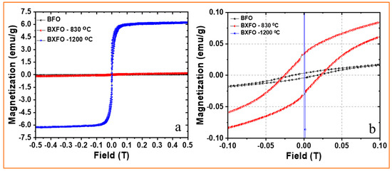 (a) M-H hysteresis loops of BXFO-830 °C and BXFO-1200 °C in comparison with pristine BFO ceramics; (b) magnified hysteresis of (a).