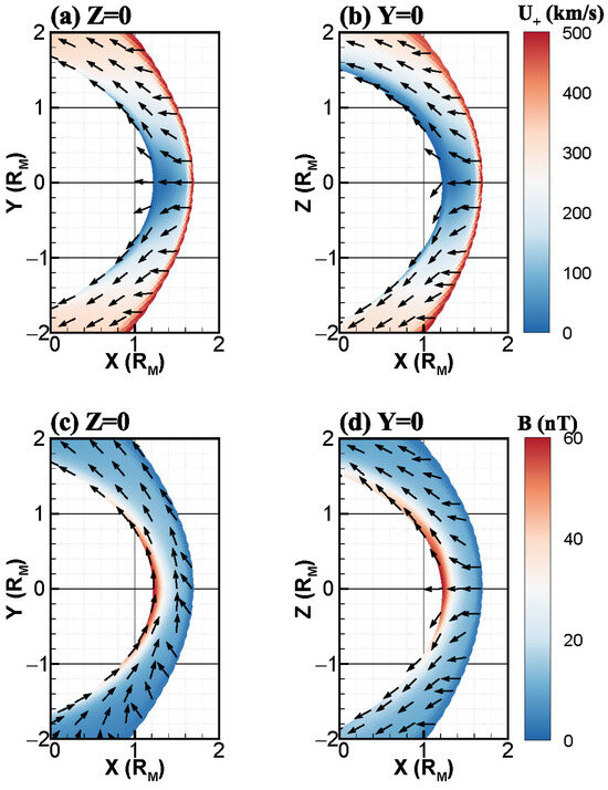 In order to elucidate the physical mechanisms underlying the asymmetrical distribution of , as described by , Figure 2 provides the distributions of the (a,b) velocity , (c,d) magnetic field , and (e,f) the angle between and in the XY and XZ magnetosheath separately, along with corresponding vectors in panels (a–d). The deceleration and deflection of plasma velocity in the magnetosheath are clearly demonstrated in Figure 2a,b. Furthermore, the velocity distribution exhibits symmetry in the XY magnetosheath but asymmetry in the XZ magnetosheath, indicating a higher near the inner boundary of the magnetosheath compared to its counterparts (). These findings are consistent with previous statistical observations presented in the MSE coordinate [24,25,26]. The interplanetary magnetic fields drape the planet as they traverse the bow shock and pile up around the inner boundary of the magnetosheath, as depicted in Figure 2c, while the draping magnetic fields are observed to be stronger near the inner boundary of the magnetosheath () compared to the corresponding (, Figure 2d), which is consistent with previous studies [27,28]. However, the asymmetry features of the velocity and magnetic field in the XZ magnetosheath cannot be reproduced by a single-fluid multi-species MHD model due to the assumption that all ion species, which are decoupled in our multi-fluid model, are coupled to share the same velocity and temperature during the single-fluid simulations [28,30]. Therefore, the asymmetrical feature of is not observed in the study by Qiao et al. [12], attributed to their employment of a single-fluid MHD model. The angle between and in the magnetosheath can be inferred from Figure 2e,f. Specifically, it is observed that they are predominantly parallel in the magnetosheath, anti-parallel in the magnetosheath, and quasi-vertical in the XZ magnetosheath. This behavior is primarily attributed to the initial solar wind velocity directed only along the , as well as to an upstream interplanetary magnetic field aligned with the XY plane following a Parker spiral angle. Due to the absence of significant asymmetry characteristics in the distribution of within the XZ magnetosheath, it can be deduced that the asymmetrical features of and , namely the stronger magnitude of in the magnetosheath and stronger in the magnetosheath, are likely responsible for driving the inherent asymmetric distribution of in the XZ magnetosheath.