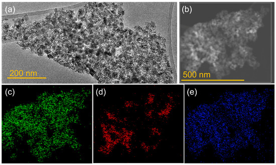 The morphology and elemental mapping of composites were analyzed using a transmission electron microscope (TEM, JEOL JEM 2100UHR, Tokyo, Japan) operating at 200 kV, equipped with an energy dispersive X-ray spectrometer (EDXS, Oxford X-Max80, Oxfordshire, UK). For TEM observations, the particles were deposited on a carbon-coated copper grid from suspension.