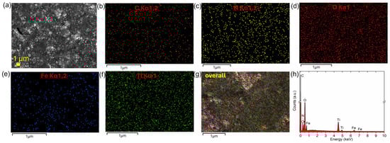 The morphological features of the designed photocatalytic nanocomposite were investigated by scanning electron microscopy (SEM) to observe the formed structure at lower magnification (Figure 3a, Figures S4 and S5). Elemental mapping of the individual components of the nanocomposite was also performed (Figure 3b–g), together with EDXS spectra analysis (Figure 3h). The same characterization was performed for IO-bPEI (Figure S4) and TiO2@CA (Figure S5). The SEM images revealed that the formed IO-TiO2 nanocomposite has a rather homogeneous structure, which is advantageous for the improvement of the photocatalytic process. The elements present in IO-bPEI and TiO2@CA were also confirmed by elemental mapping (Figures S4 and S5). However, due to the limited magnification of the SEM images, individual NPs and the detailed structure of IO-TiO2 could not be clearly recognized, in contrast to Figure 2 and Figures S2 and S3 (Supplementary Information). The TEM was used for this purpose (Figure 2). Elemental mapping of the typical elements in the nanocomposite (C, N, O, Fe, and Ti; Figure 3b–g) showed a uniform distribution, confirming the successful formation of the nanocomposite with moderately uniformly distributed NPs. The EDXS spectrum (Figure 3h) also confirmed the presence of all constituent elements in the IO-TiO2 nanocomposite.