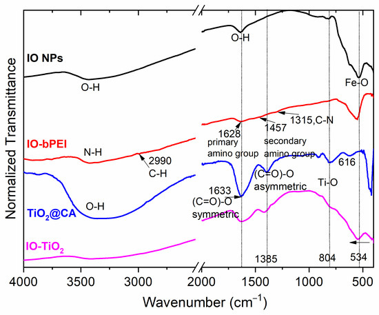 The results of ATR-IR spectroscopy for all samples are shown in Figure 4. The peak at 534 cm−1 associated with Fe-O (in IO NPs), as identified in [75], is present in both the IO-bPEI and IO-TiO2 samples, indicating the successful formation of the designed nanocomposite. The peaks at 1620 cm−1 and around 3200 cm−1 correspond to the O-H bending and stretching of the water molecules in the IO NPs. The successful functionalization of IO NPs with bPEI is evidenced by new peaks. In particular, the peaks at 3400 cm−1 and 1628 cm−1 correspond to N-H stretching and bending of primary amines, while the peak at 1457 cm−1 corresponds to N-H stretching of secondary amine groups [76]. In addition, the C-N stretching peak at 1315 cm−1 confirms the presence of amine-containing molecules [77]. The presence of TiO2 is confirmed by typical peaks at 804 cm−1 and 616 cm−1, which are attributed to Ti-O stretching [78]. In addition, the presence of citric acid on TiO2 NPs was suggested by peaks characteristic of carboxylic acids. This was evident from the peaks at 1633 cm−1 and 1385 cm−1, which correspond to the symmetric and asymmetric stretching of the C=O group [49], respectively. After hetero-agglomeration of TiO2@CA with IO-bPEI, these peaks are less pronounced, which is probably due to a lower concentration. However, the broadening of the peak indicates the formation of hydrogen bonds [79] and, furthermore, an electrostatic interaction between negatively charged citric acid and positive bPEI. Indeed, the peaks present on the individual NPs are also clearly visible in the nanocomposite IO-TiO2 (Figure 4). Thus, infrared spectroscopy confirmed the successful functionalization of the IO-bPEI particles with bPEI and the hetero-agglomeration of TiO2@CA with IO-bPEI.