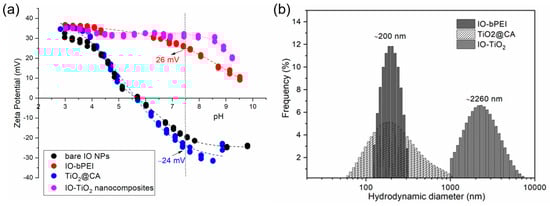 At low pH (acidic conditions, e.g., 3–4), the surface of magnetic nanoparticles (IO NPs) is usually positively charged due to the adsorption of hydrogen ions (H+) and the zeta potential might be around +30 mV (Figure 6a). Above pH 5, it starts to decrease until reaching the isoelectric point (e.g., pH 5.8), where the zeta potential approaches 0 mV. At high pH (above the isoelectric point), the surface is typically negatively charged due to the adsorption of hydroxide ions (OH−). It reaches a negative zeta potential plateau value at around pH 7.5. Positive and negative zeta potential plateau levels are reached at the absolute value of zeta potential, where the stability of colloidal dispersion is guaranteed [83]. Interestingly, TiO2@CA shows very similar behavior of zeta potential as a function of pH as bare IO NPs. The zeta potential of TiO2@CA nanoparticles as a function of pH exhibits similar characteristics to IO NPs, which is reasonable since both are metal oxide nanoparticles with a tendency to be positive in acidic conditions due to the adsorption of H+ and negative at higher pH due to the adsorption of hydroxide ions (OH−) [75]. Both zeta potential plateau levels, positive and negative, are slightly higher (positive) and lower (negative) in comparison to IO NPs, which may be connected to CA, especially by the lower negative zeta potential plateau level where carboxylic acids of CA are available on the particles surface to be in protonated form [49]. IO-bPEI shows successful functionalization with bPEI, where the zeta potential is positive across the entire pH range due to the protonated amino groups [76], in line with the potentiometric titration curve of bPEI (Figure S6), where the highly positive character of the latter is revealed. There is a tendency of decreasing positive zeta potential slowly above pH 7, which may be due to less accessibility of amino groups due to their deprotonation (see potentiometric titration curve of bPEI) and thus to possible slight agglomeration. IO-TiO2 nanocomposites show the dominating character of IO-bPEI due to almost the same ZP (pH) curve as for IO-bPEI. This means that at hetero-agglomeration of IO-TiO2 nanocomposites by electrostatic interactions among IO-bPEI and TiO2@CA NPs, IO-bPEI chemistry dominates.