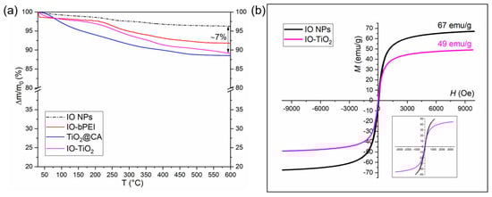 Thermogravimetric analysis (TGA) was performed to determine the mass loss of the different nanomaterials, and the resulting curves were compared (Figure 7a). The bare IO NPs showed a minimum mass loss of about 3–4 wt%, probably due to the presence of physically adsorbed water. After modification with bPEI, the IO NPs showed a more significant mass loss of about 5 wt%, indicating the presence of an organic coating on the IO-bPEI. For the TiO2@CA nanoparticles, the TGA curves indicated a mass loss of 12 wt%, which is likely due to the citric acid (CA) coating and reveals distinct decomposition patterns. When TiO2@CA was combined with IO-bPEI, the nanocomposite displayed a maximum mass loss of 11 wt% at 600 °C. This indicates a successful formation of the nanocomposite. The IO-TiO2 nanocomposite exhibited a TGA curve that reflects the properties of both nanomaterials of which it is composed. The organic species within the nanocomposite began to decompose above 120 °C and decomposed almost completely up to 600 °C, likely resulting in volatile products [84]. This thermal behavior is further evidence of the successful integration of the components into the nanocomposite. The magnetic properties of the bare IO NPs and the synthesized IO-TiO2 nanocomposite were investigated by hysteresis loop measurements. As illustrated in Figure 7b, both the bare IO NPs and the nanocomposite exhibit superparamagnetic behavior characterized by negligible coercivity and remanence [85,86]. This is of crucial importance since superparamagnetic NPs do not exhibit spontaneous magnetic moments and thus prevent agglomeration due to magnetic dipole-dipole interactions, in contrast to larger particles [87,88]. The saturation magnetization of the IO NPs decreased from an initial 67 emu/g to 49 emu/g when combined TiO2@CA and IO-bPEI. This decrease is due to the presence of organic coatings and non-magnetic material within the nanocomposite. Despite this decrease, the IO-TiO2 nanocomposite retained remarkable magnetic properties that enabled effective magnetic separation of the nanocatalyst after the photocatalytic process in the presence of an external magnetic field. The strong magnetic response of the nanocomposite is significant as it enables not only enhanced photocatalytic activity but also efficient removal and reusability, minimizing additional environmental pollution. This dual functionality underlines the potential of the developed nanocomposite for practical applications in environmental remediation.