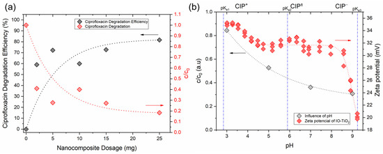 Influence of the nanocomposite amount (a) and pH values (b) on ciprofloxacin photocatalytic degradation. Conditions for effect of IO-TiO2 dosage were: 50 mL of 0.008 g/L ciprofloxacin, pH 7, 2 h of irradiation with UV-B light. Conditions for effect of pH were: 10 mg of IO-TiO2, 50 mL of 0.008 g/L ciprofloxacin, 2 h of irradiation with UV-B light.