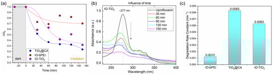 Kinetic degradation of ciprofloxacin by photocatalysis using TiO2@CA, IO-bPEI, and IO-TiO2 (a), UV-Vis spectra of corresponding IO-TiO2 at different degradation times (b), and degradation rate constant for all samples (c), derived from a pseudo-first order kinetic model. The used photocatalytic conditions were pH of 7, 50 mL of 0.008 g/L ciprofloxacin, and 10 mg of nanocomposite.
